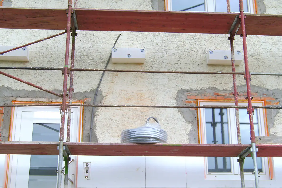 Besonders bei Klappläden wirken unglaubliche Kräfte auf die Unterkonstruktion ein. Elemente müssen dauerhaft stabil, druckfest und vor allem gut dämmend sein. Selbst bei sehr hohen Fassadendämmstärken erfüllt der COMPACFOAM Montageblock diese Anforderungen. Der Montageblock wird mit Kleber direkt an der Wand als Element des Vollwärmeschutzes angebracht. Zur Befestigung der Markisenkonsole werden Bolzenanker oder eine Gewindestange durch den Montageblock in der tragenden Wand verankert.